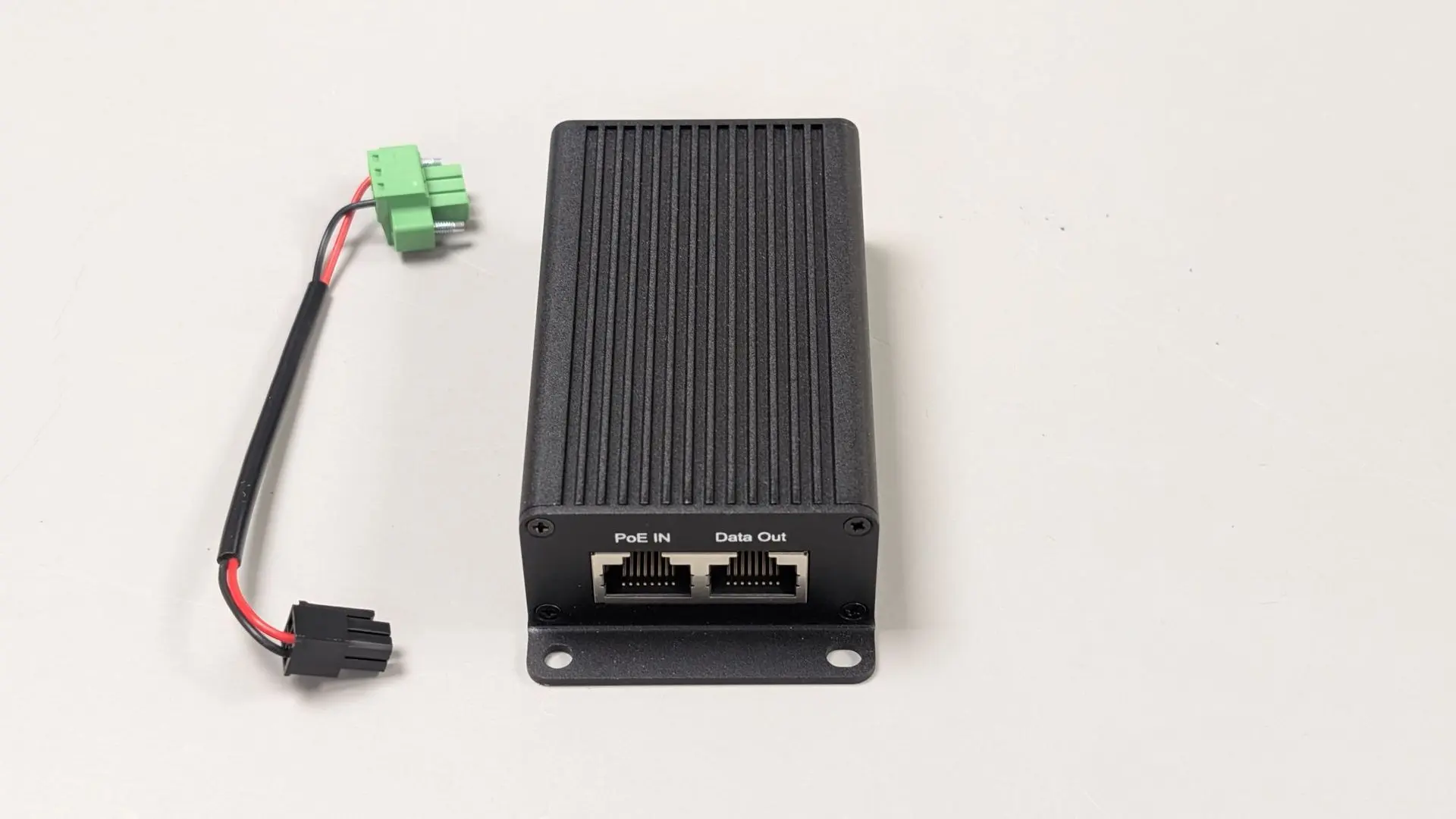 Splits a single PoE connection into separate 12VDC power and Ethernet outputs, allowing use with devices that do not support PoE directly. Designed for industrial and outdoor environments, with a wide operating temperature range and durable metal enclosure.