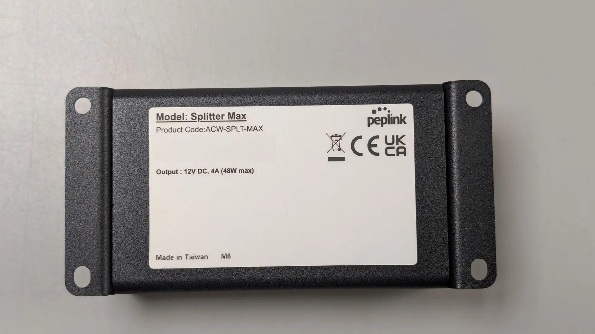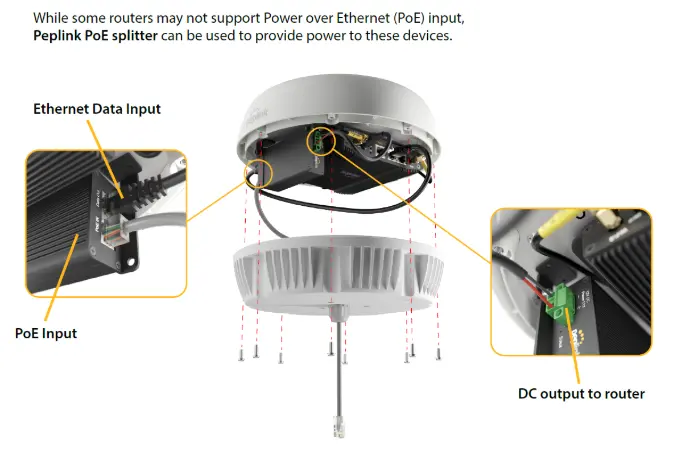 The PEP-ACW-SPLT-MAX is commonly paired with Peplink's Antenna MAX to facilitate installations where PoE is available, but the device requires a separate DC power input and Ethernet data connection